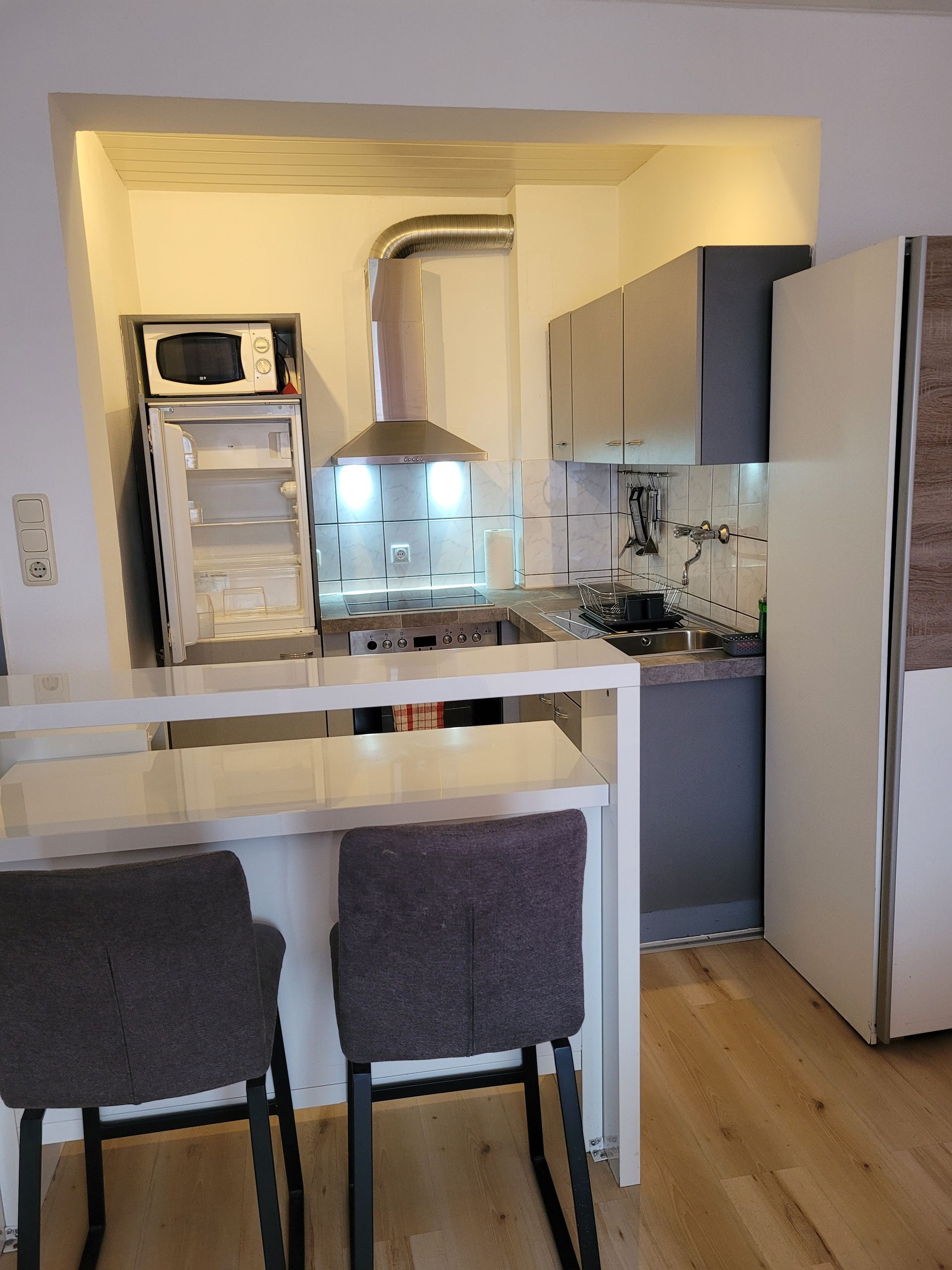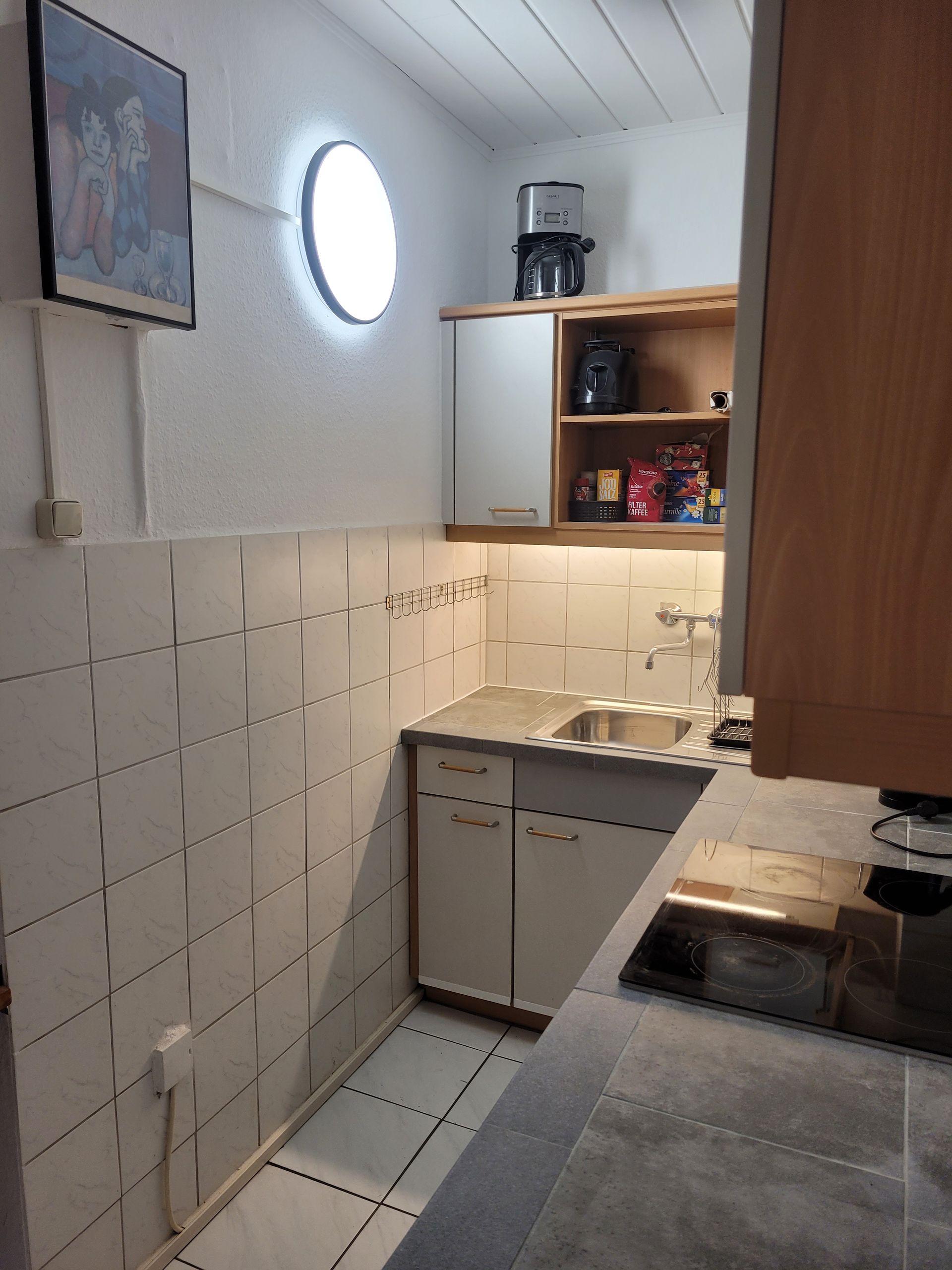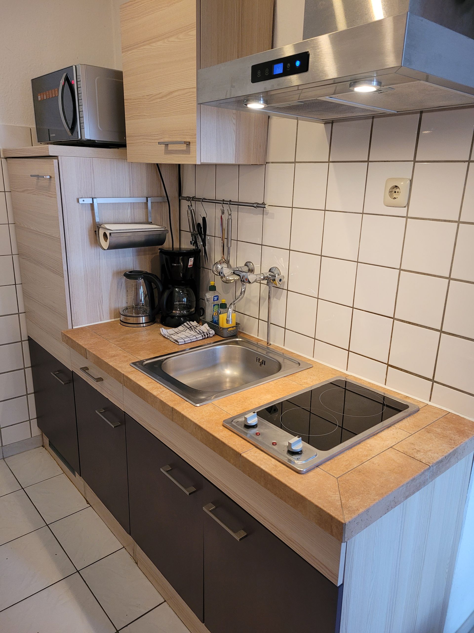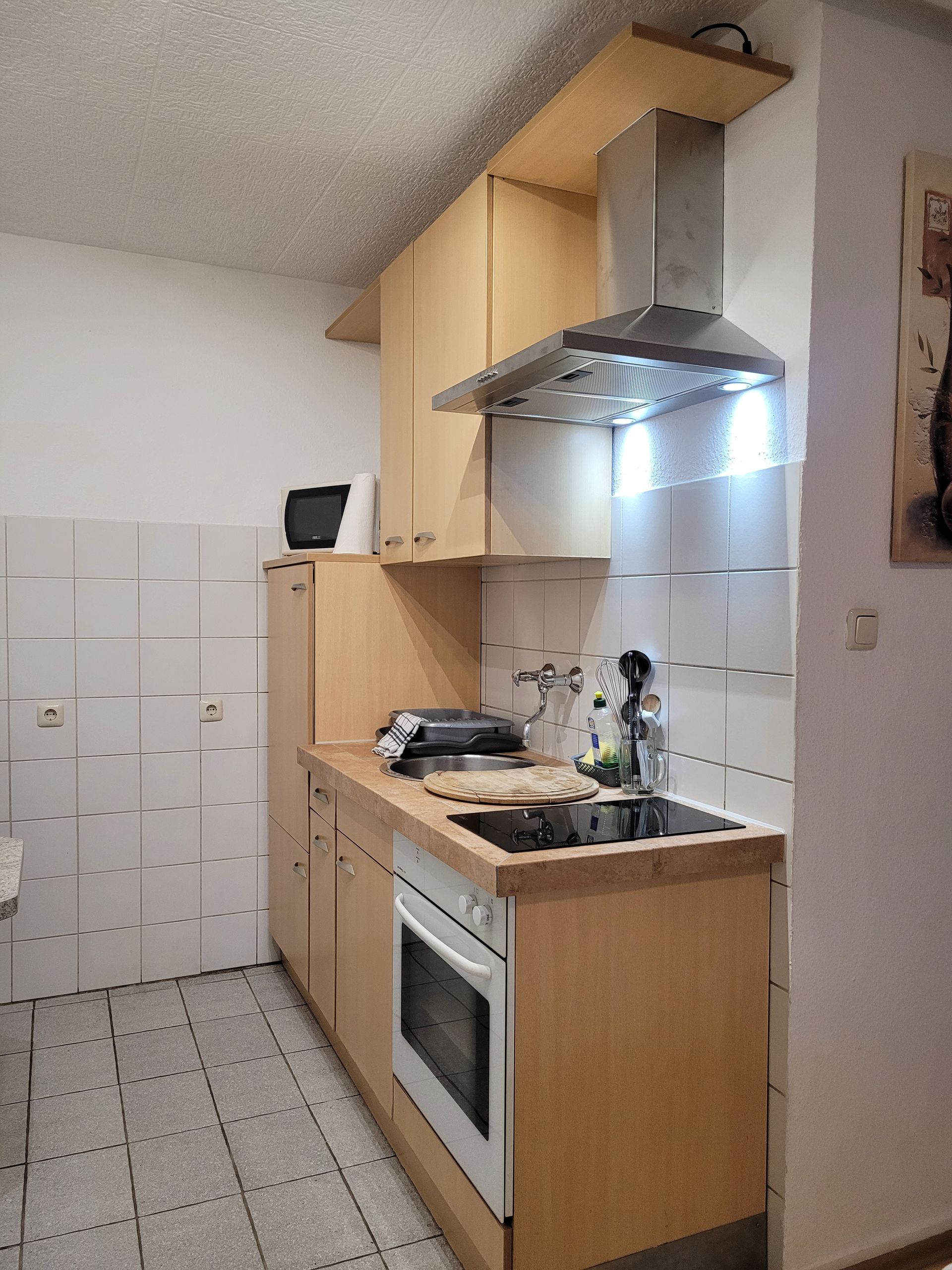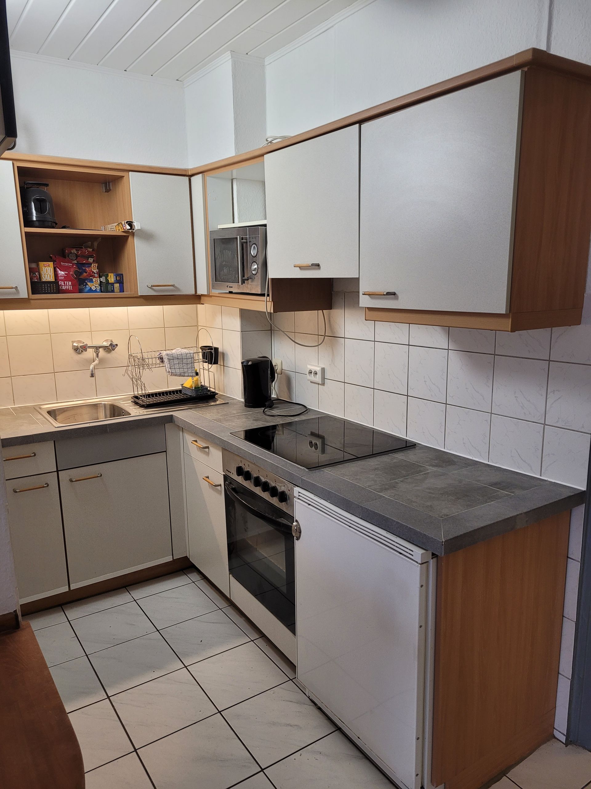 Der Blick in die Küche ist vielversprechend. Das 4 Platten Cerankochfeld mit Backofen, Kühlschrank, Gefriefach und Mikrowelle wird noch verschönert duch die silbergraue gefließte Arbeitsplatte. Hygienisch, praktisch gut.