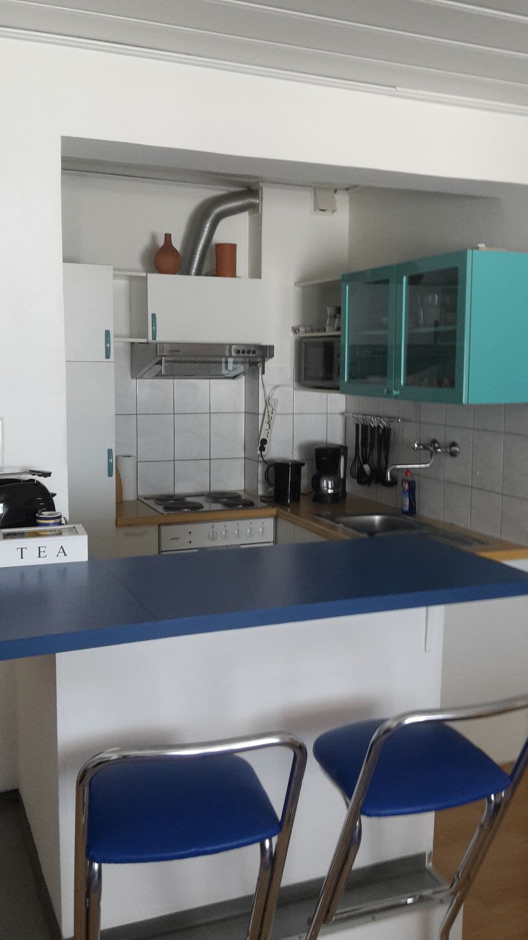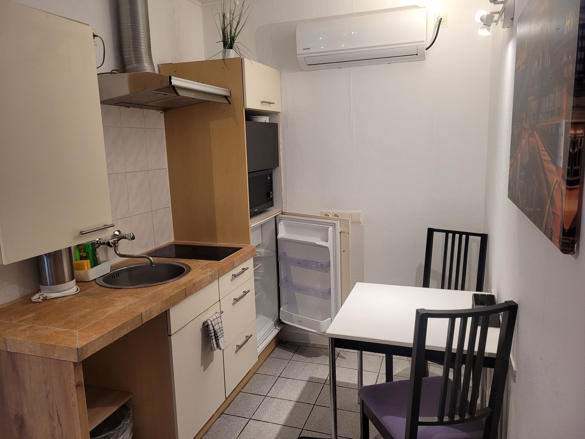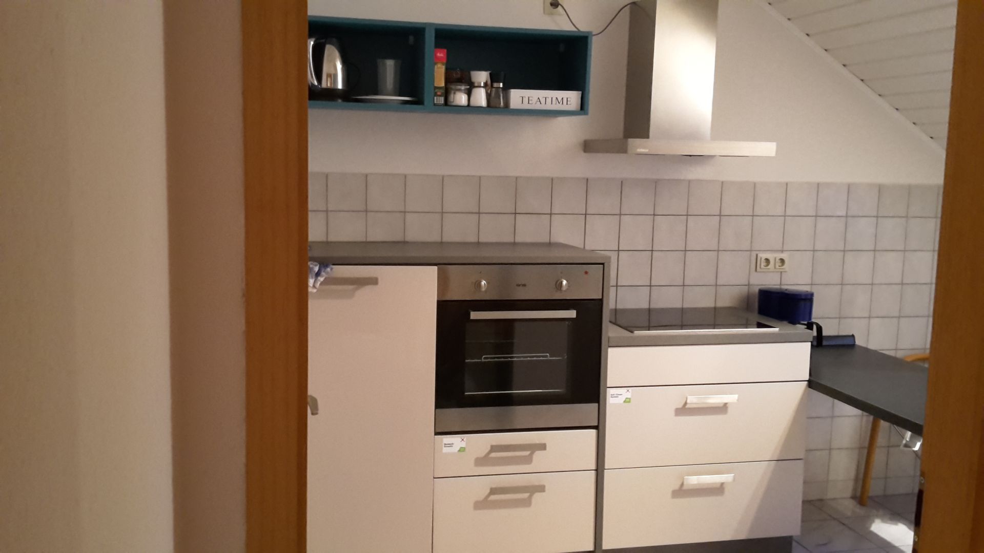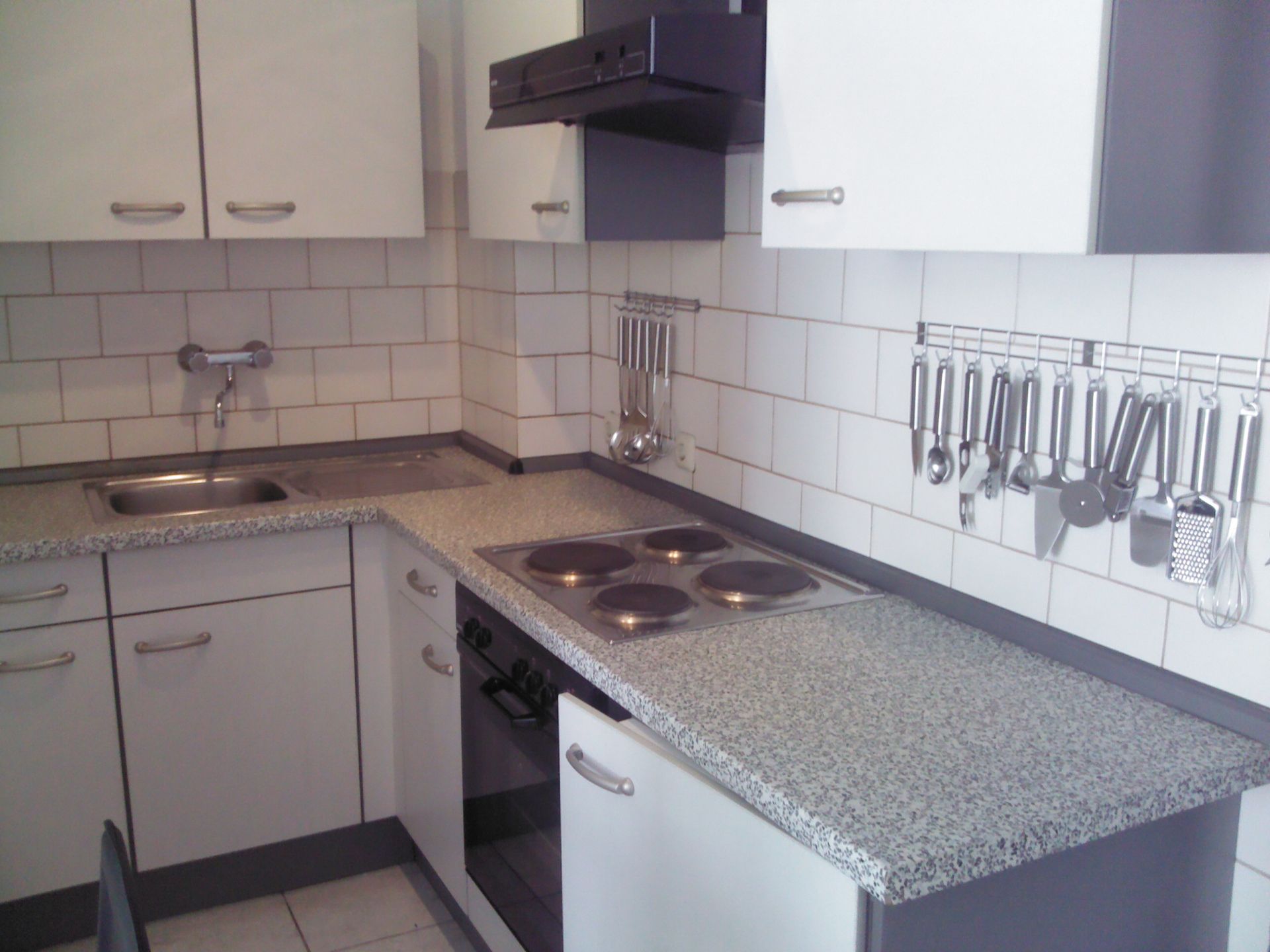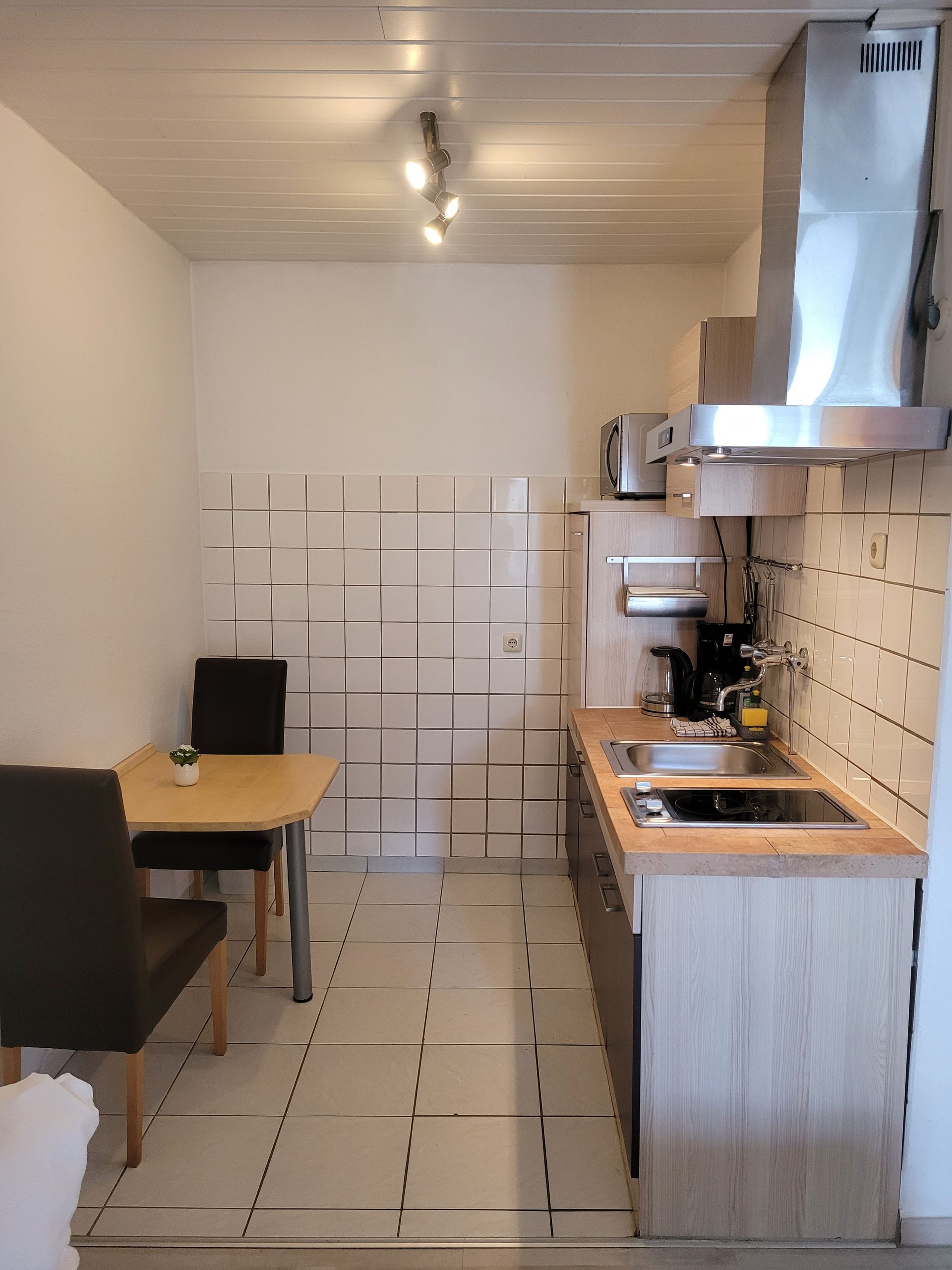 Der Blick in die Küche ist vielversprechend. Das 4 Platten Cerankochfeld mit Backofen, Kühlschrank, Gefriefach und Mikrowelle wird noch verschönert duch die silbergraue gefließte Arbeitsplatte. Hygienisch, praktisch gut.