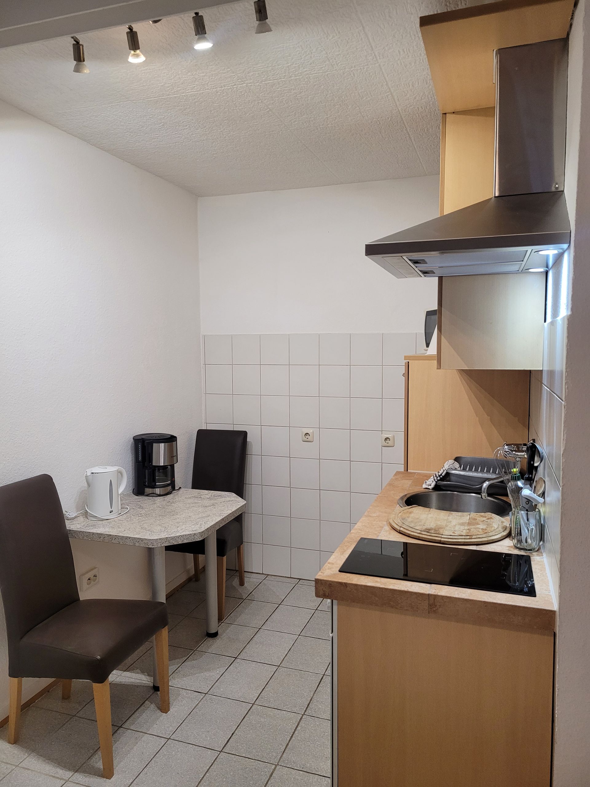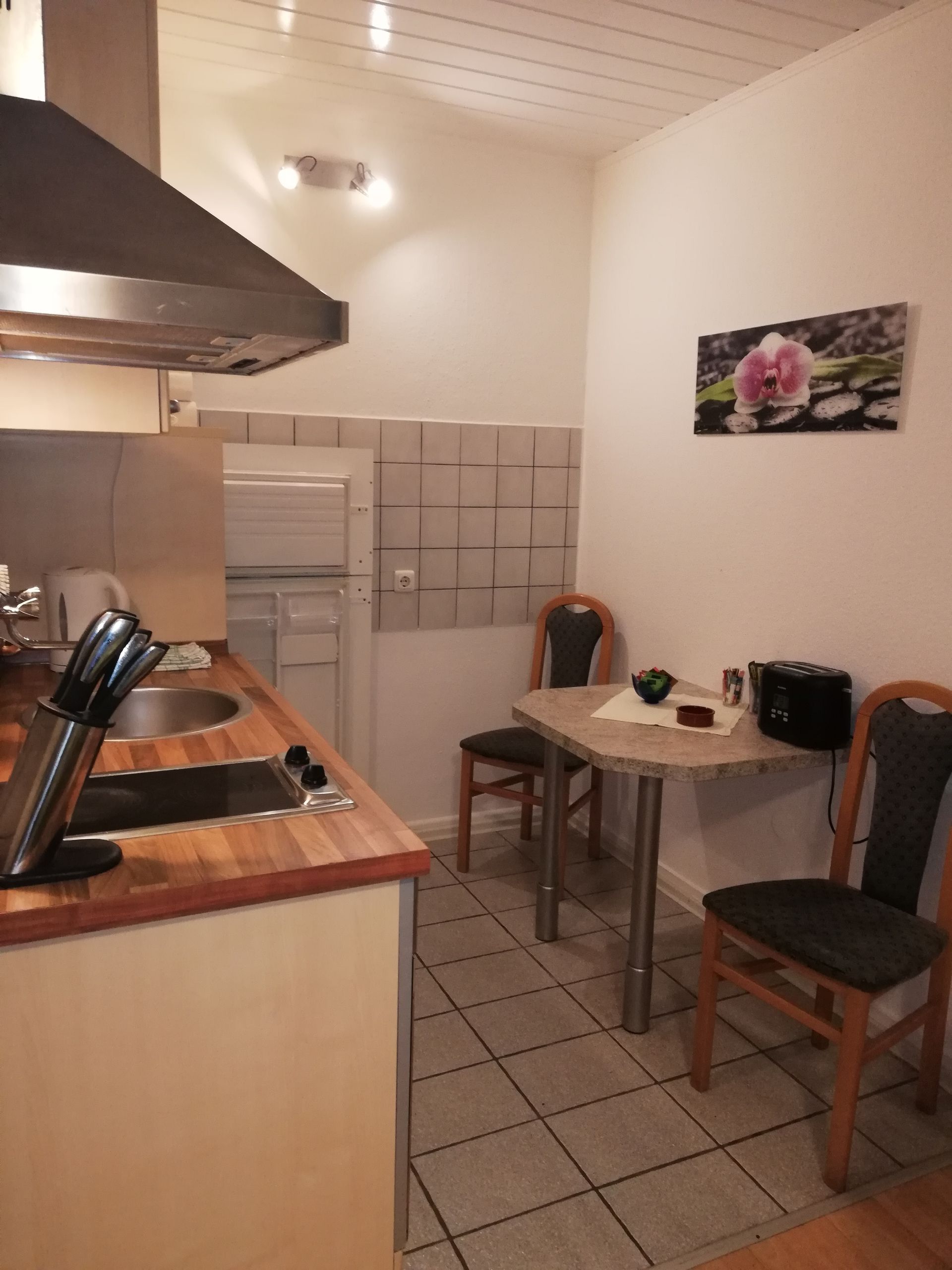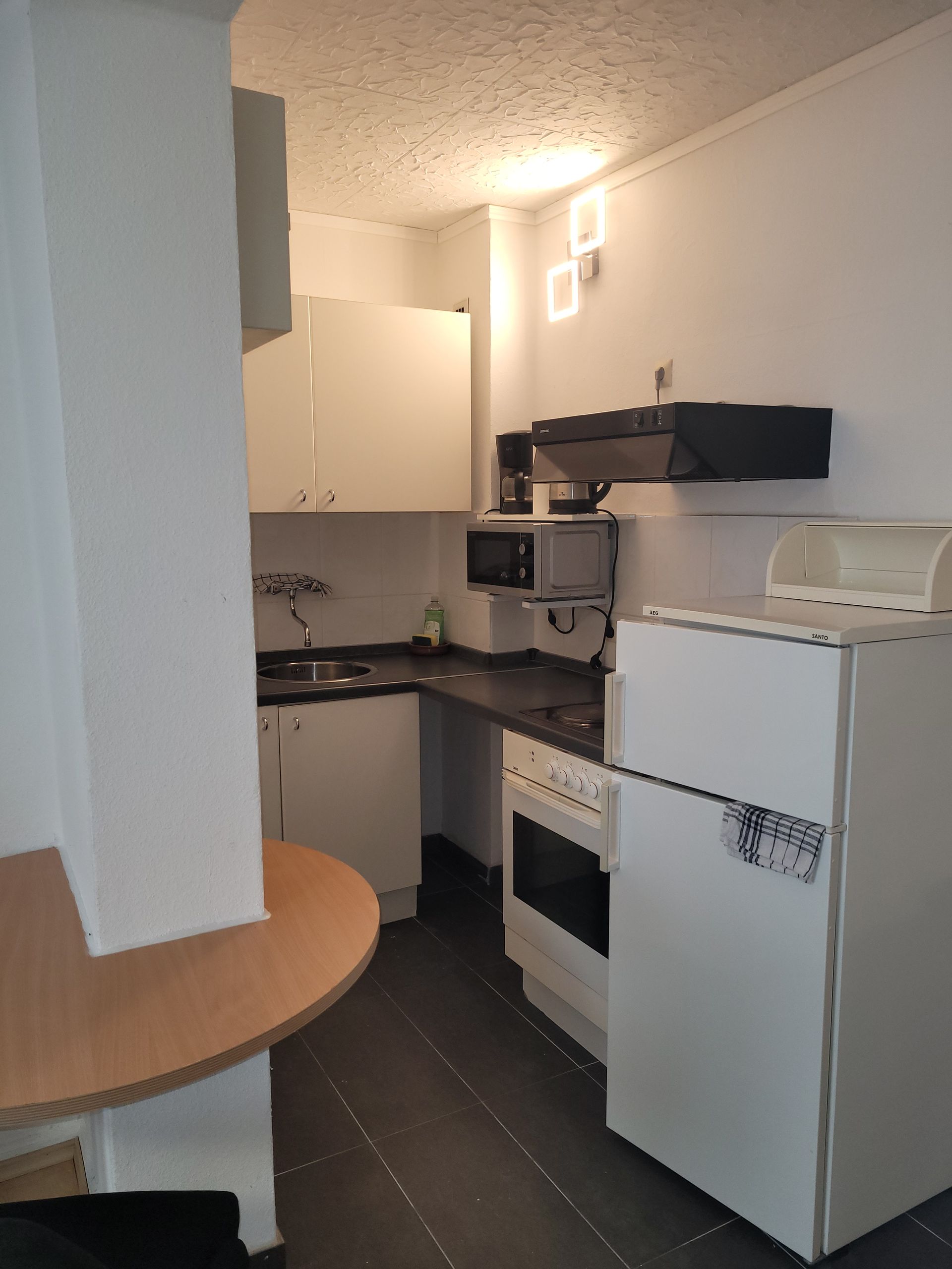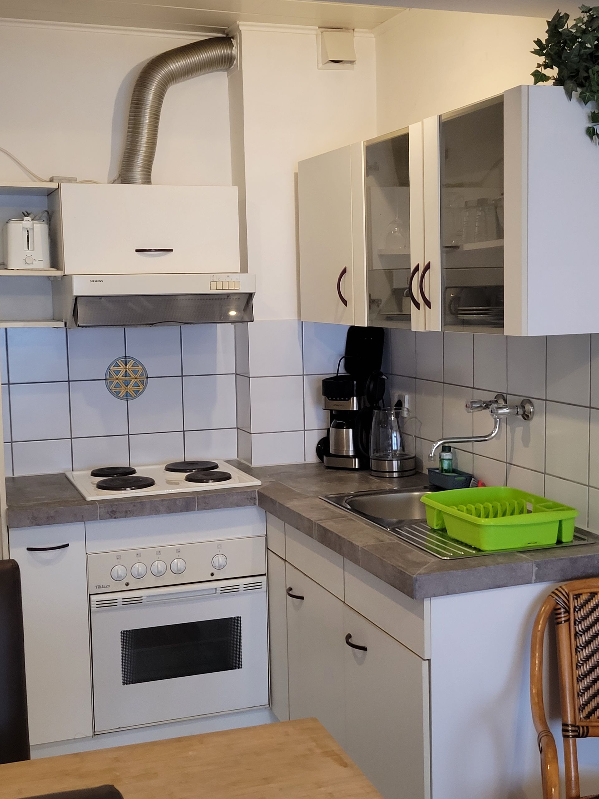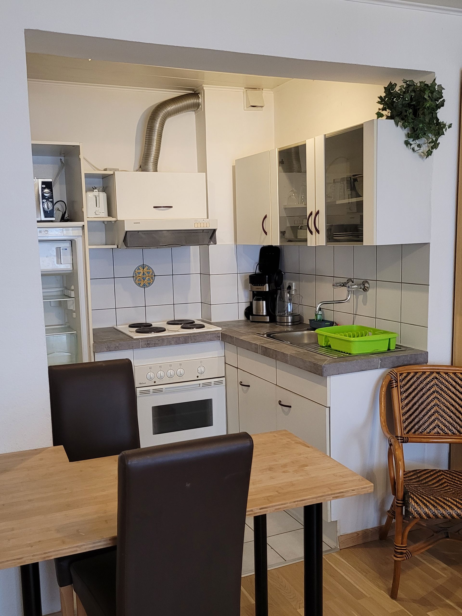 Die gut ausgestattete Küchenzeile bietet alle Möglichkeiten für einen Kurzaufenthalt. Vom Kühlschrank bis zum großzügigen Gefrierfach, ein Backofen, Spühle und ein 4 Platten Kochfeld haben Sie alles, was man zur Essensvorbereitung benötigt. Der an die Küche angrenzende Essentisch kann zugkeich auch als Arbeitstisch verwendet werden, obwohl es im Apartment auch einen Schteibtisch gibt.