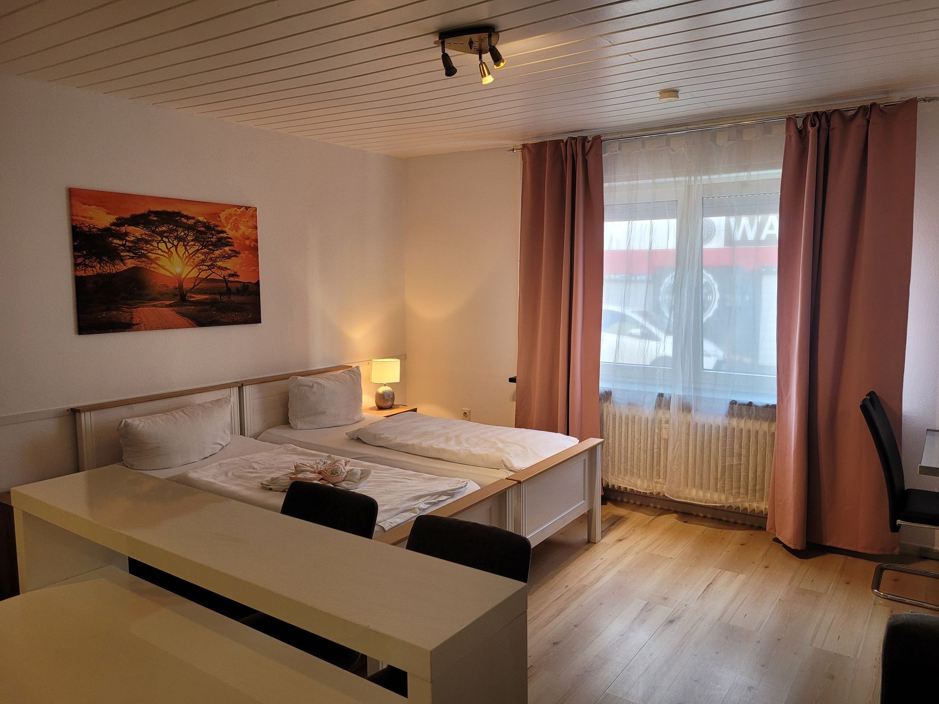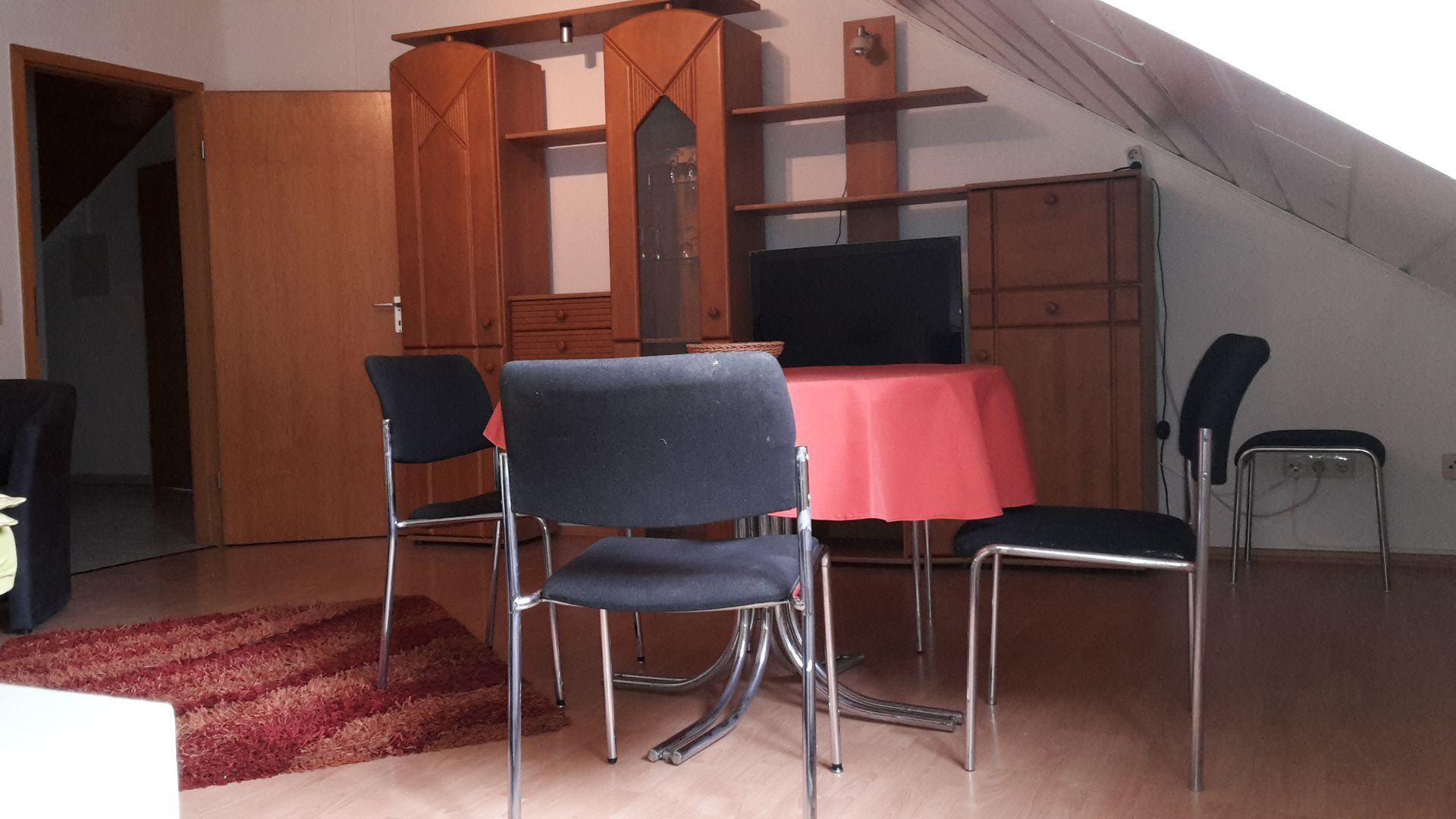 Der nahegelegene Esstisch kann zum einen zum dinieren verwendet zum anderen aber auch zum arbeiten verwendet werden.