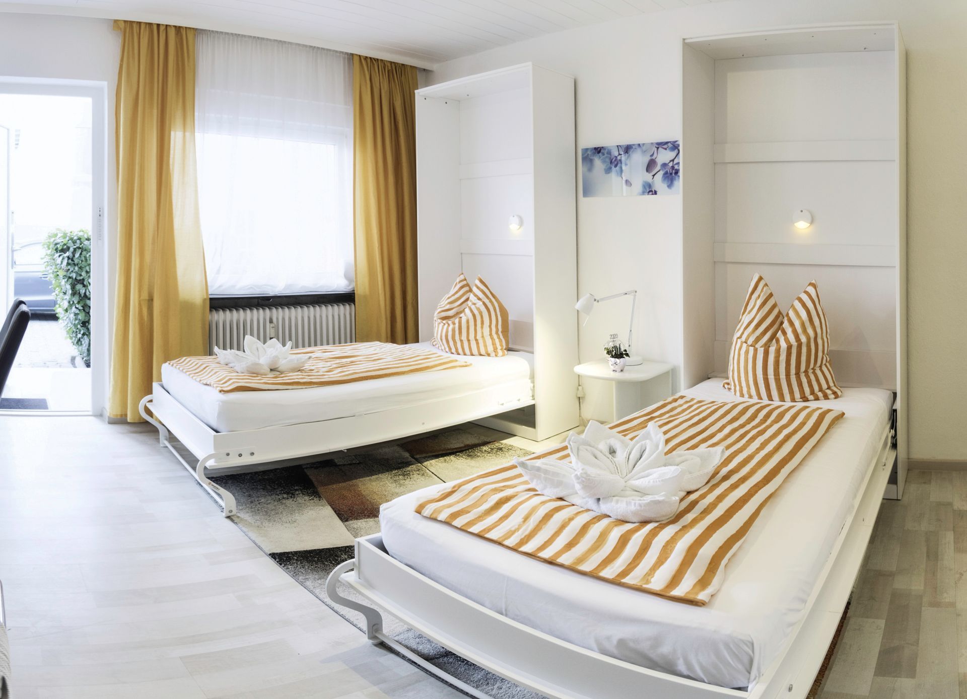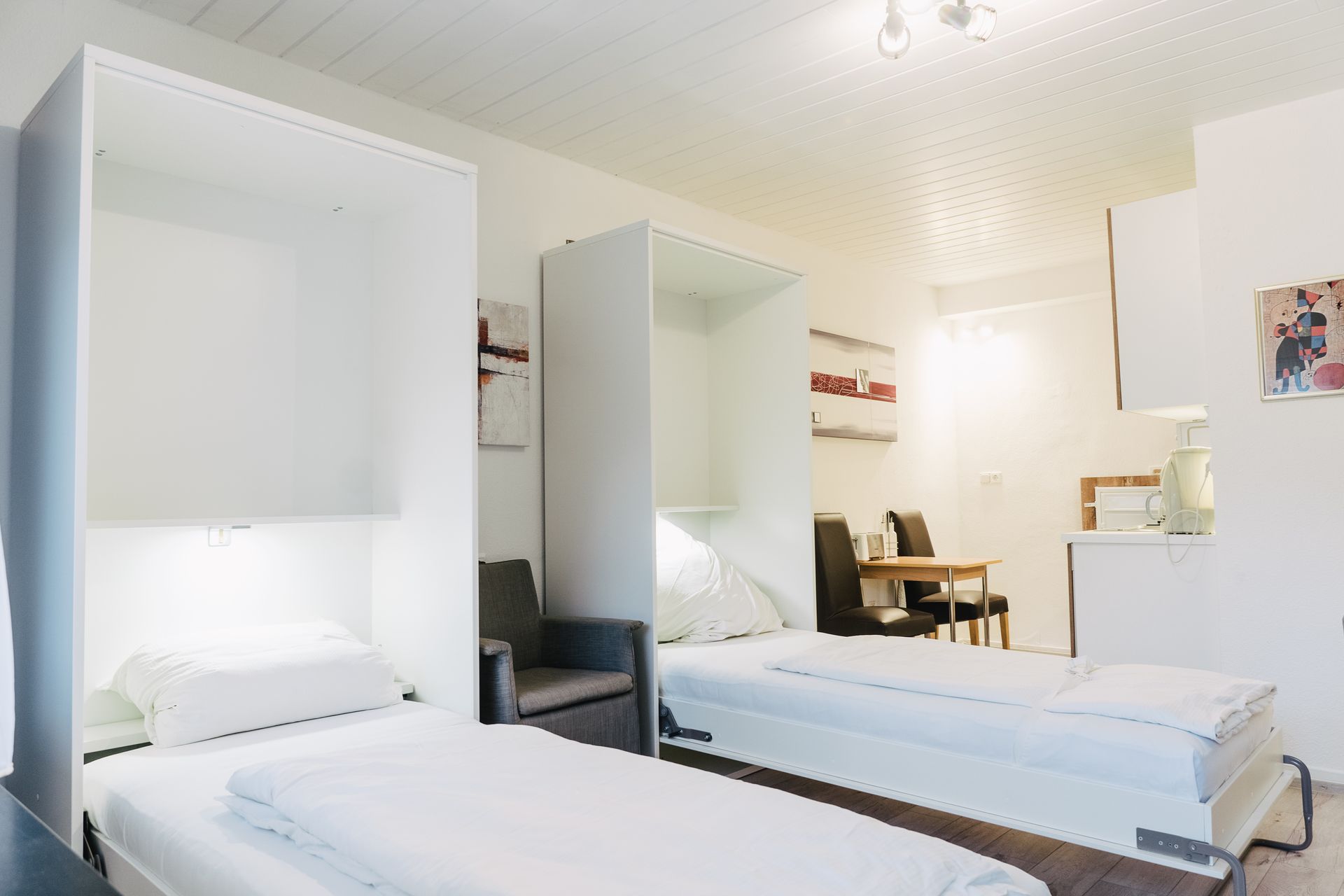 Die gemütlichen Einzelbetten können bei Bedarf weggeklappt werden.