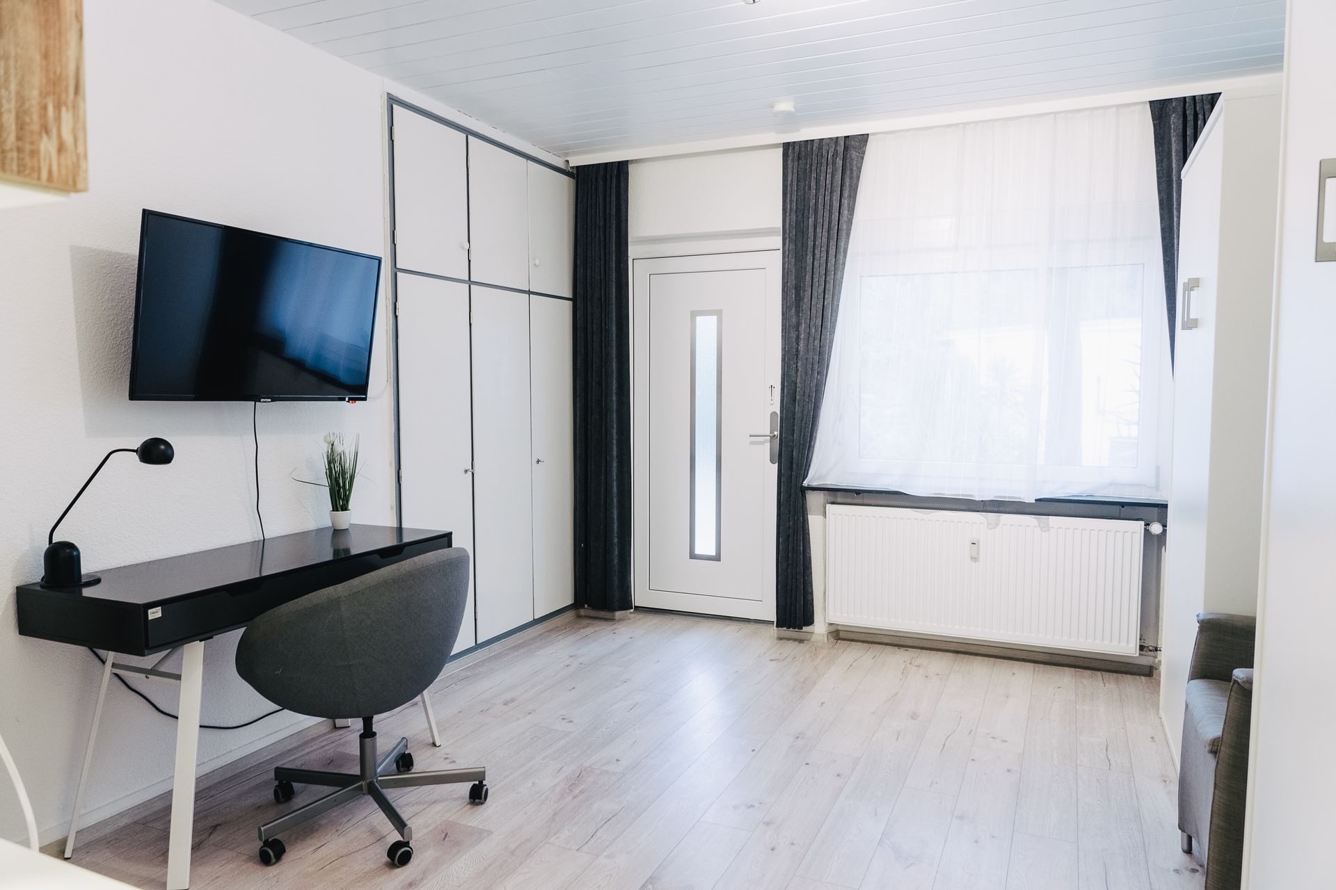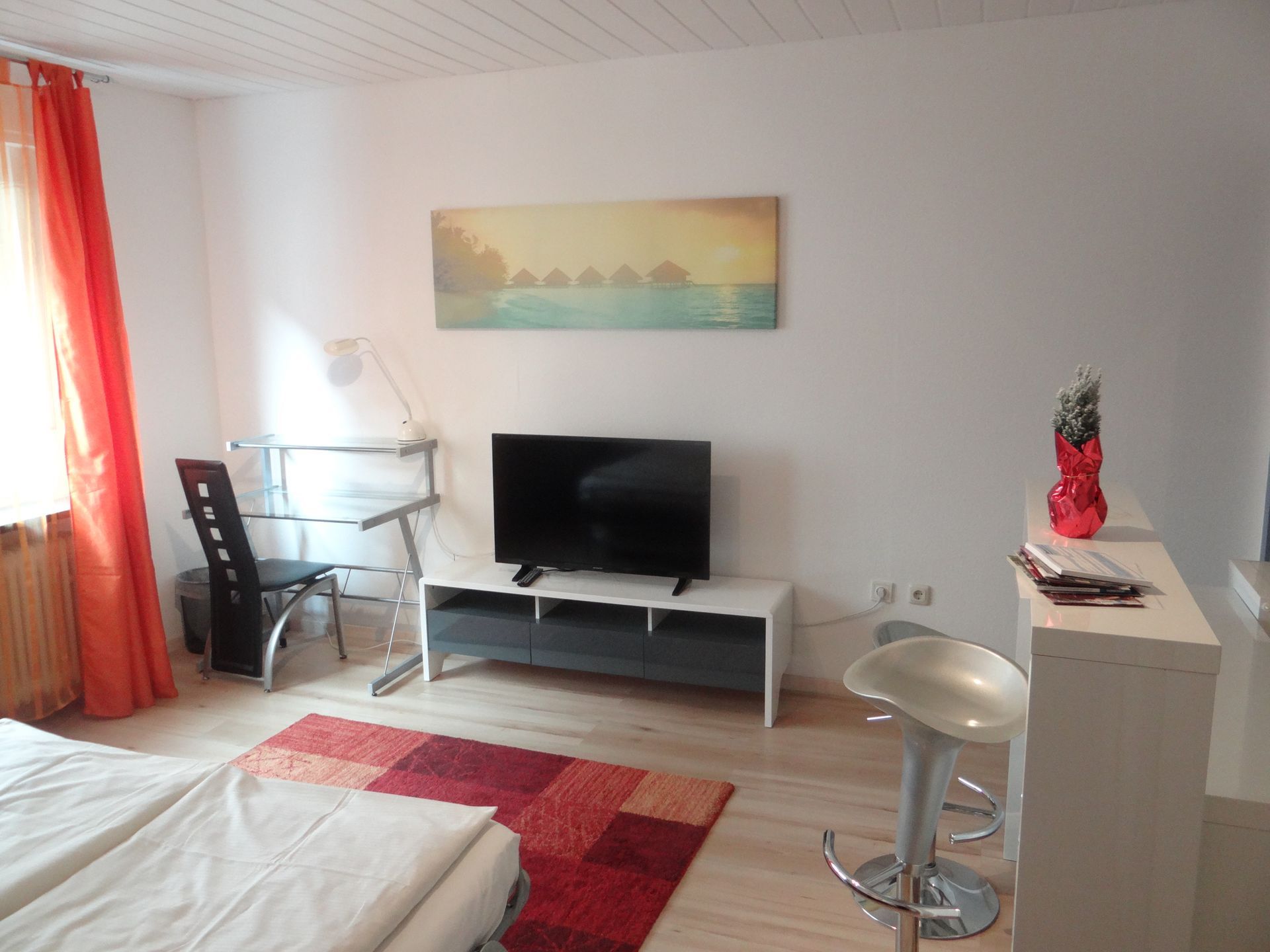 Die multimediaecke mit Smart TV und Schreibtisch. Für Gäste, die beruflich unterwegs sind, eignet sich dieses Studio ganz besonders.