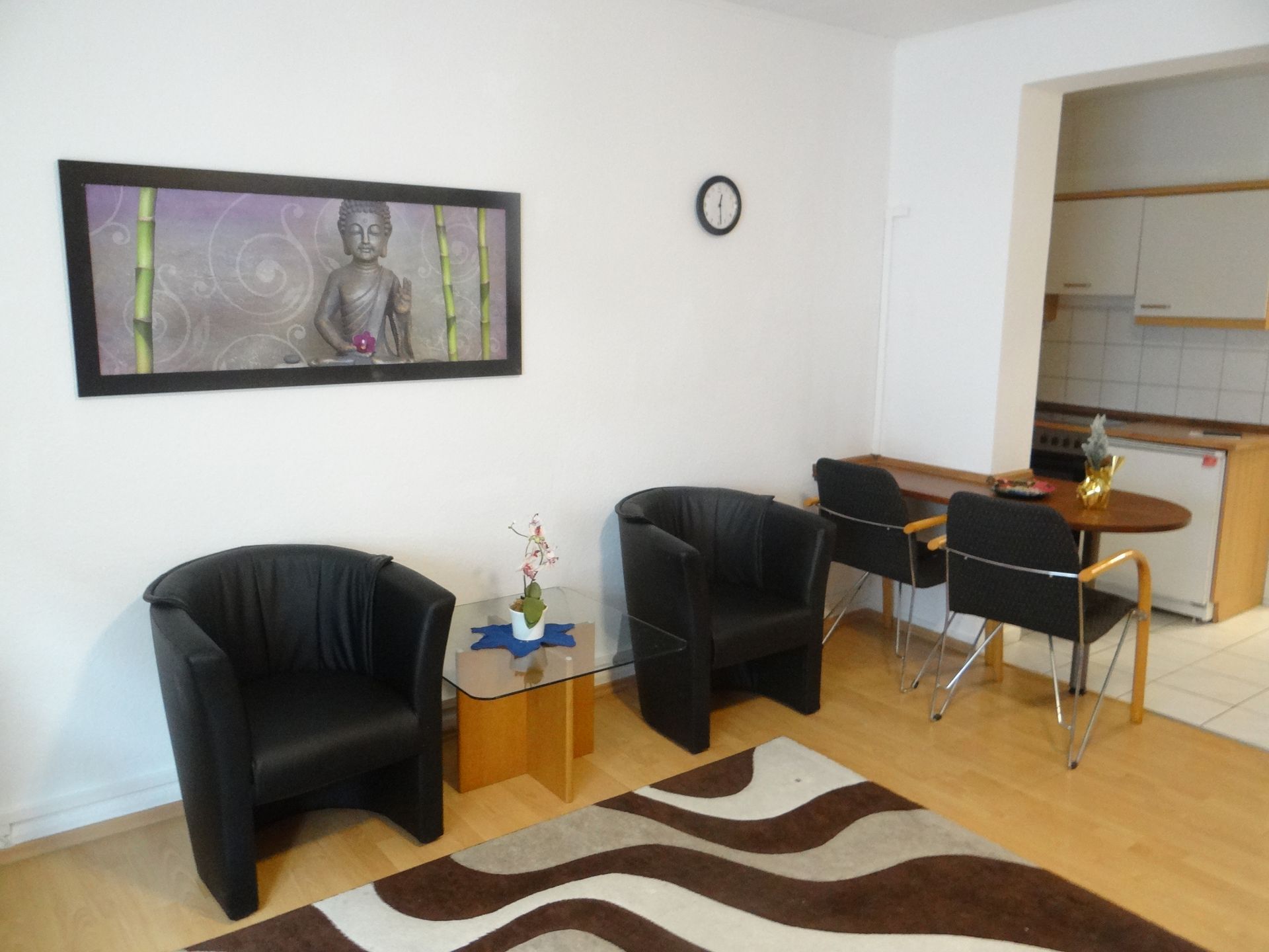 Die gut ausgestattete Küchenzeile bietet alle Möglichkeiten für einen Kurzaufenthalt. Vom Kühlschrank bis zum großzügigen Gefrierfach, ein Backofen, Spühle und ein 2 Platten Kochfeld haben Sie alles, was man zur Essensvorbereitung benötigt. Der in der Küche stehende Essentisch kann zugkeich auch als Arbeitstisch verwendet werden.